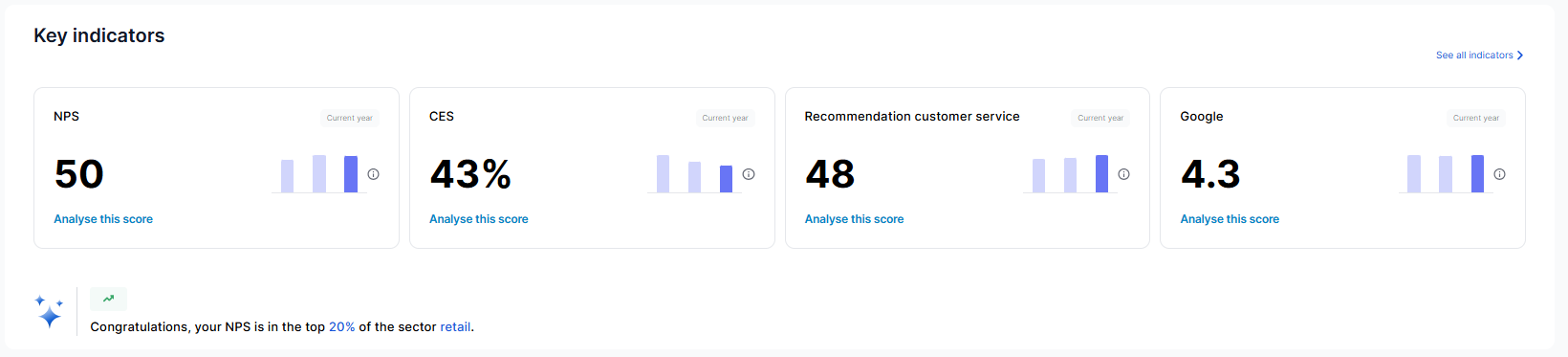 You can view details of the key indicators (evolution, cross-analysis, etc.) by clicking directly on the dedicated buttons, or by clicking on the "See all indicators" button.