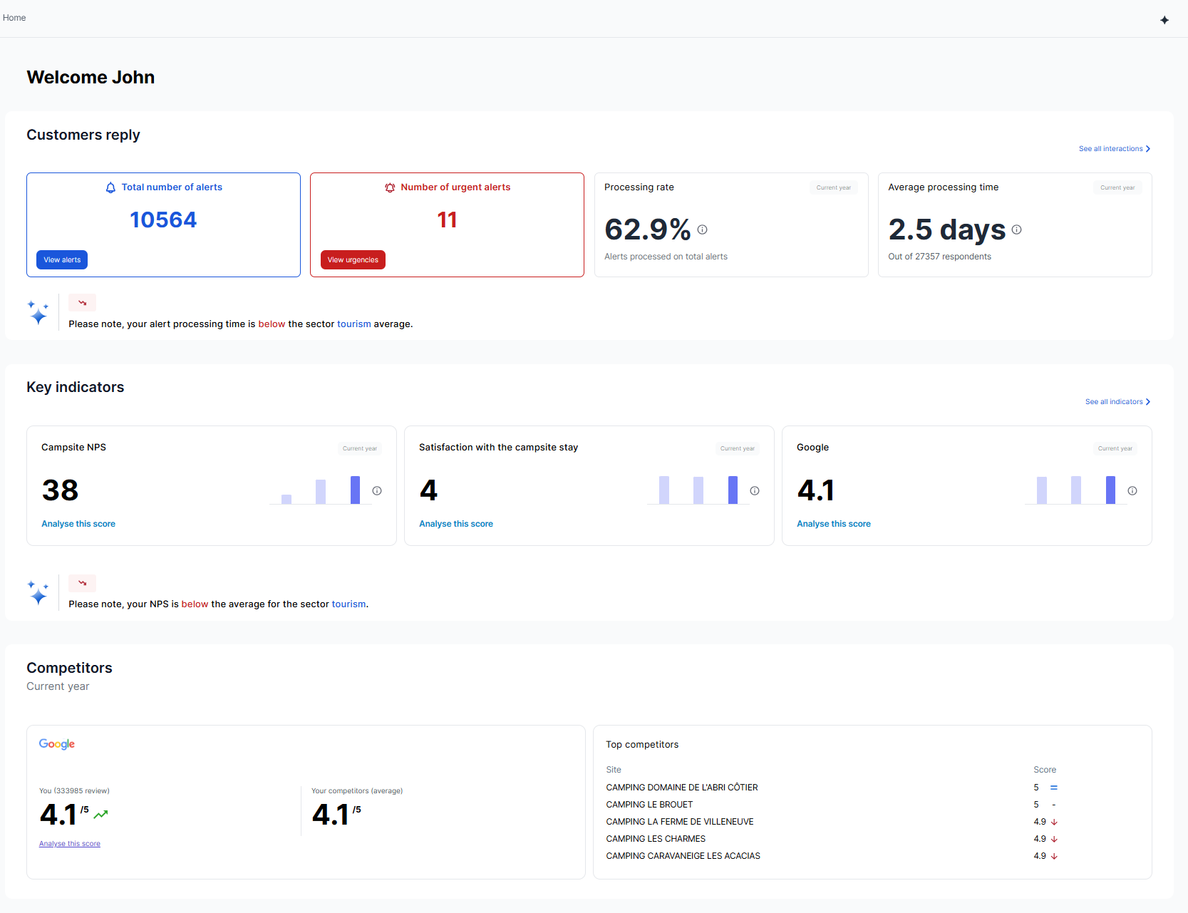The home page is divided into 3 distinct sections: the first is dedicated to customer response monitoring, the second to tracking the main KPIs of the program, and the third (optional) covers competitor benchmarking on review platforms and social networks.