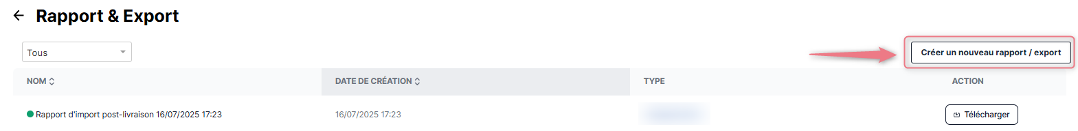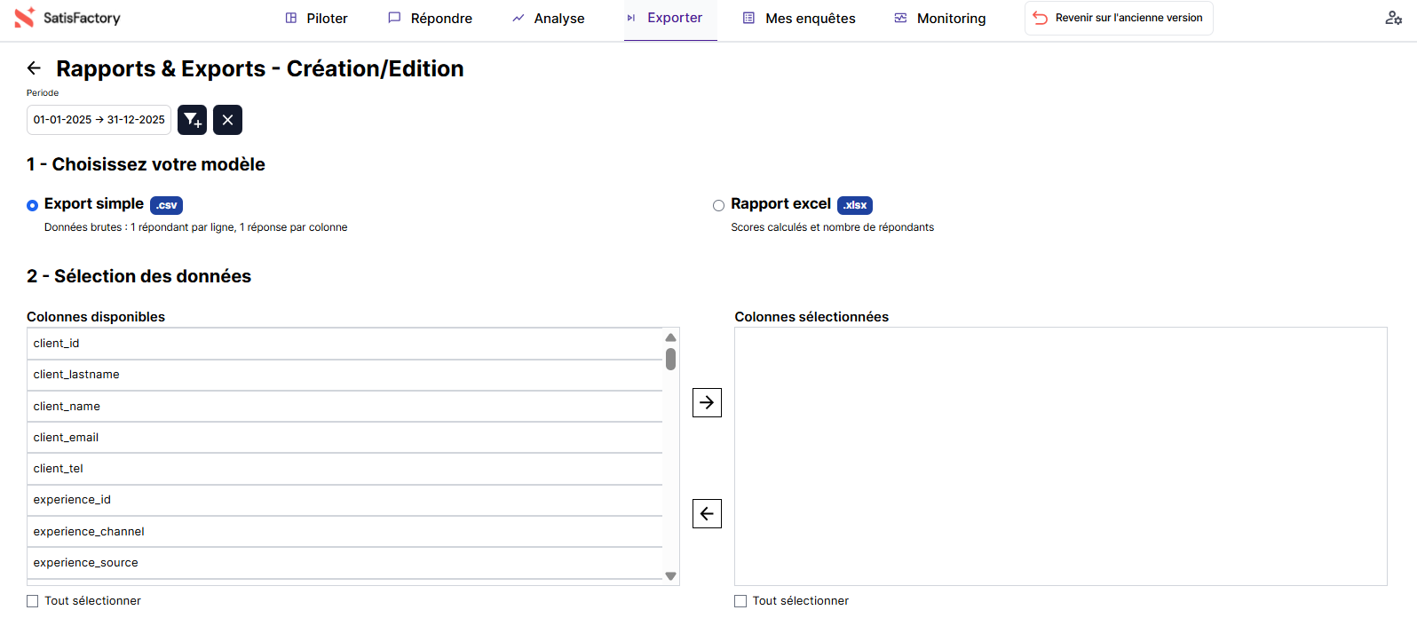 Commencez donc par vous rendre dans la plateforme SatisFactory. Dans l'onglet "Exporter", appuyez sur le bouton "Créer un nouveau rapport / export".