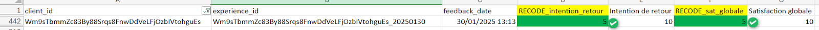 Pour vous assurer que les modifications ont bien été prises en compte par le système, ouvrez votre fichier CSV de reprise d’historique (la version de travail) et sélectionnez plusieurs experience_id correspondant à des réponses censées avoir été mises à jour. Choisissez-les de manière aléatoire et sur différentes périodes pour un échantillon représentatif.