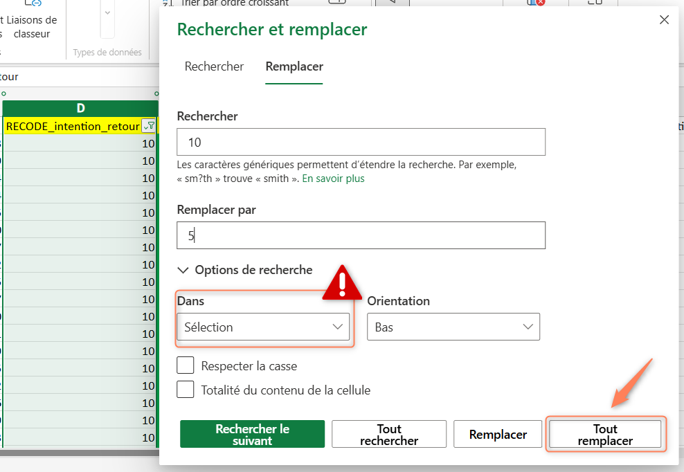 ⚠️ Si vous utilisez la fonctionnalité “Ctrl + H” pour remplacer des valeurs, veillez à sélectionner la colonne unique à modifier et choisissez d’effectuer le remplacement seulement sur cette sélection de cellules. Dans le cas contraire, la modification des valeurs se fera dans tout le fichier et pourrait modifier des données annexes.