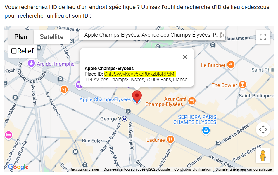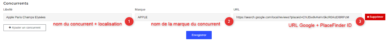 - The "competitor_url" column corresponds to the URL of the competitor’s Google page. To retrieve it, go to Google’s PlaceID Finder (https://developers.google.com/maps/documentation/places/web-service/place-id?hl=en), search for the competitor’s location, and retrieve their PlaceID. The retrieved PlaceID must then be added at the end of the following Google link: “https://search.google.com/local/reviews?placeid=”