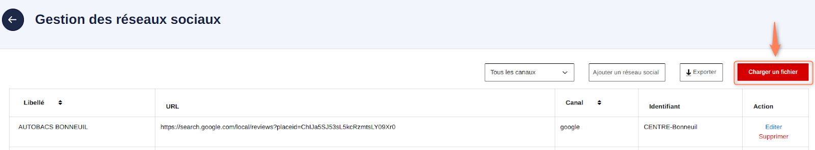 The "name" column corresponds to the name of the establishment and must be filled in with the same value as the label of the establishment shown in its edit form on the platform. - The "channel" column corresponds to the source channel of the social network and must be filled in with, for example, "google" or "trustpilot".