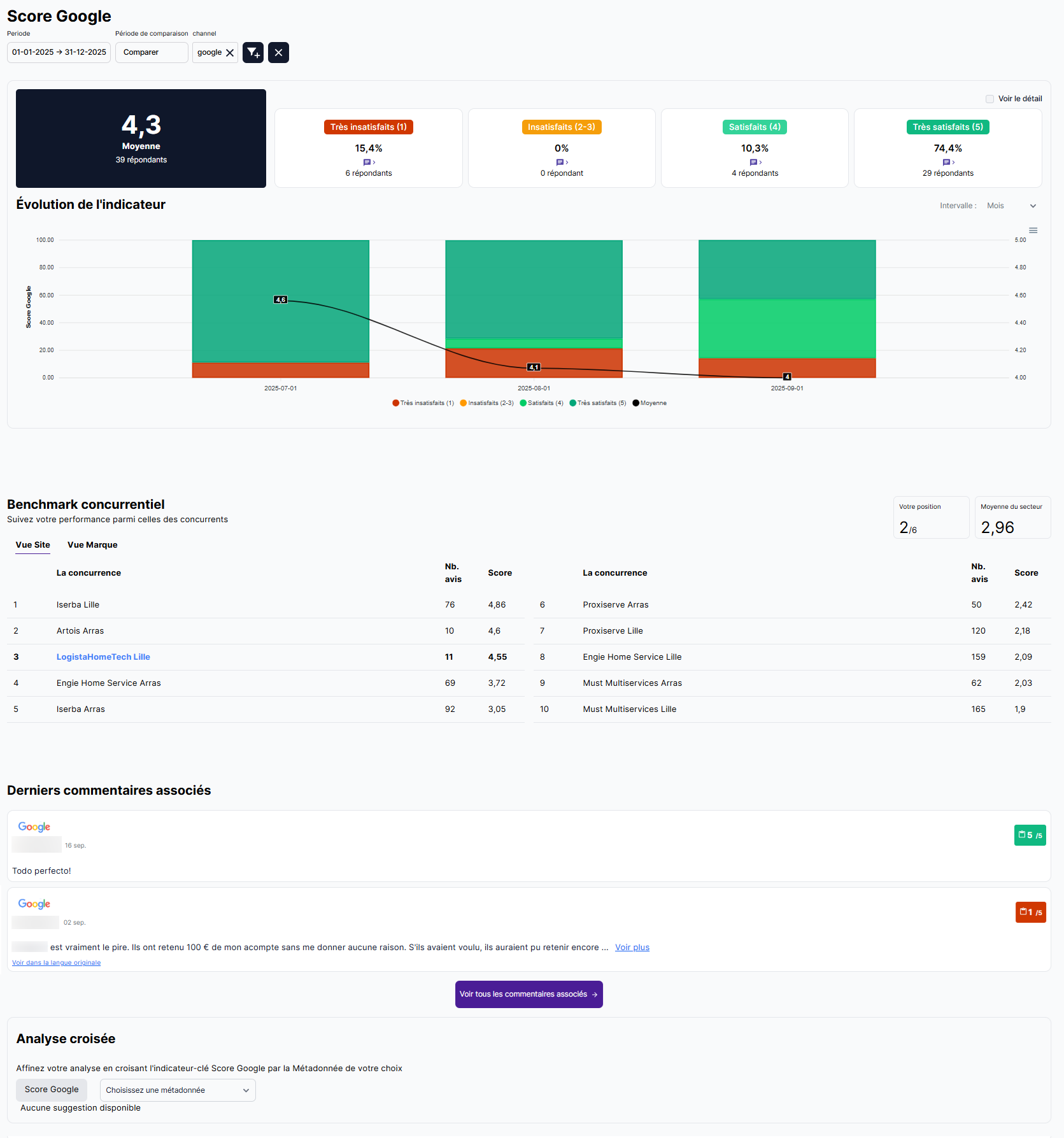 From the "Competition" section available on the platform’s homepage, you can easily access your competitors’ data for each review site or social network configured. This provides a clear and actionable view of the competitive environment of your establishments or your brand.