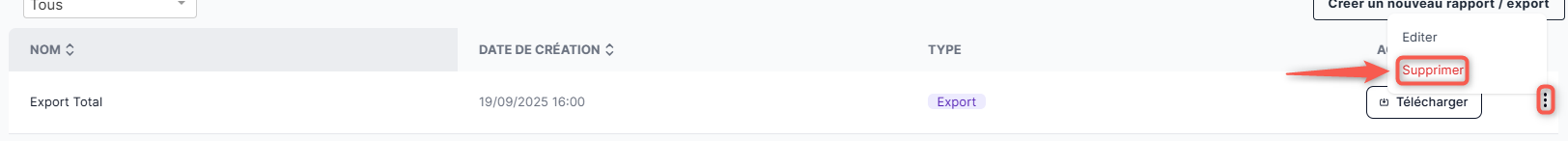 Pour supprimer définitivement un rapport/export que vous avez préalablement sauvegardé, placez-vous sur un rapport ou export déjà créé, cliquez sur l'icône représentant une ellipse verticale (⋮) puis cliquez sur "Supprimer".