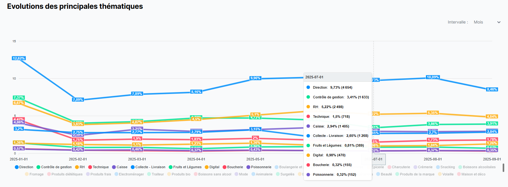Dans la section "Évolution des principales thématiques", vous accédez au graphique indiquant l'évolution de l'importance des thématiques au fil du temps, sur une période déterminée par les filtres de la page.