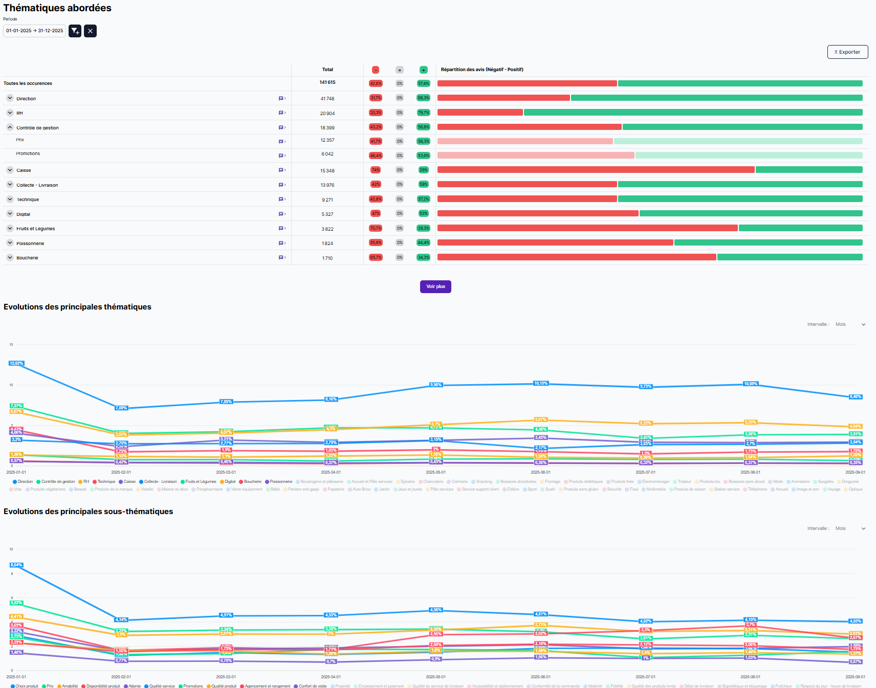 Pour une vue d'ensemble, seules les thématiques les plus importantes sont affichées. Cliquez sur le bouton "Voir plus" pour dérouler la liste intégrale des thématiques et sous-thématiques de votre dispositif d'analyse sémantique.