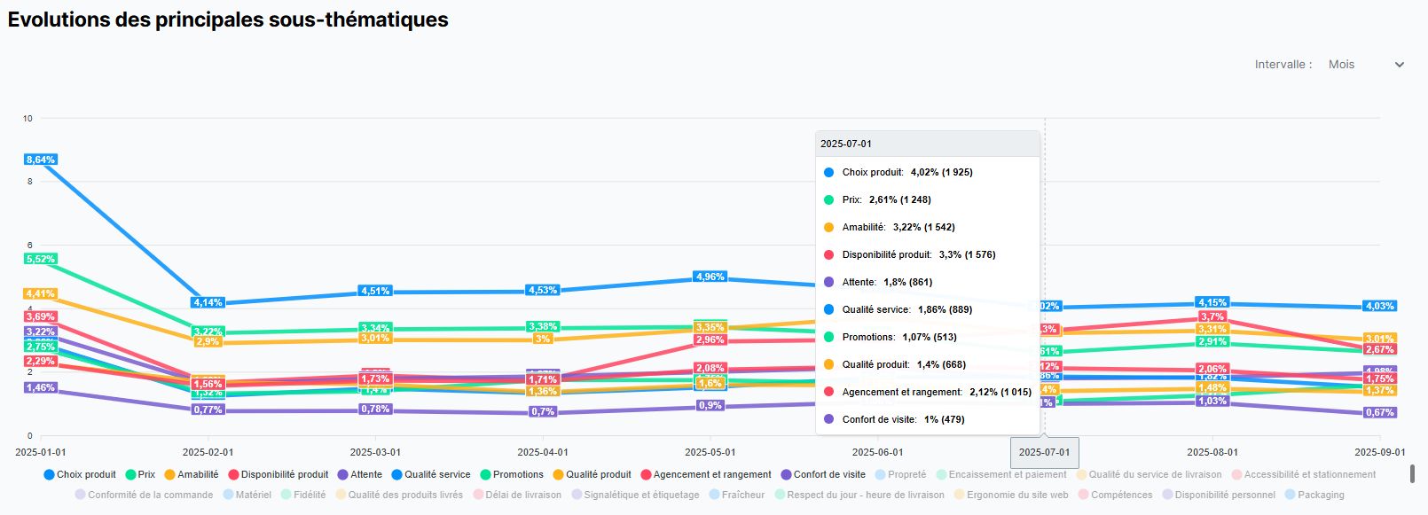 Pour plus de détails sur un élément, survolez-le dans le graphique pour faire apparaître les données détaillées de l'importance de chaque thématique sur la période donnée.