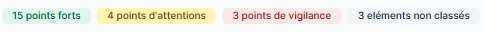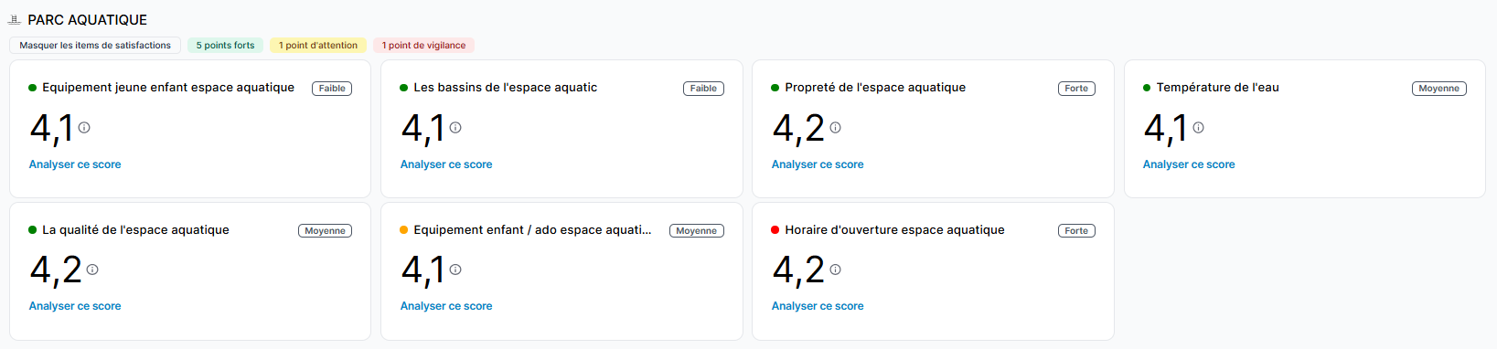 Retrouvez dans cette section les items de satisfaction classés par moments-clés. La vue initiale se concentre sur les items principaux. Vous pouvez trier l'affichage pour ne voir que les items identifiés comme un point fort, un point d'attention ou un point de vigilance en utilisant les boutons correspondants.