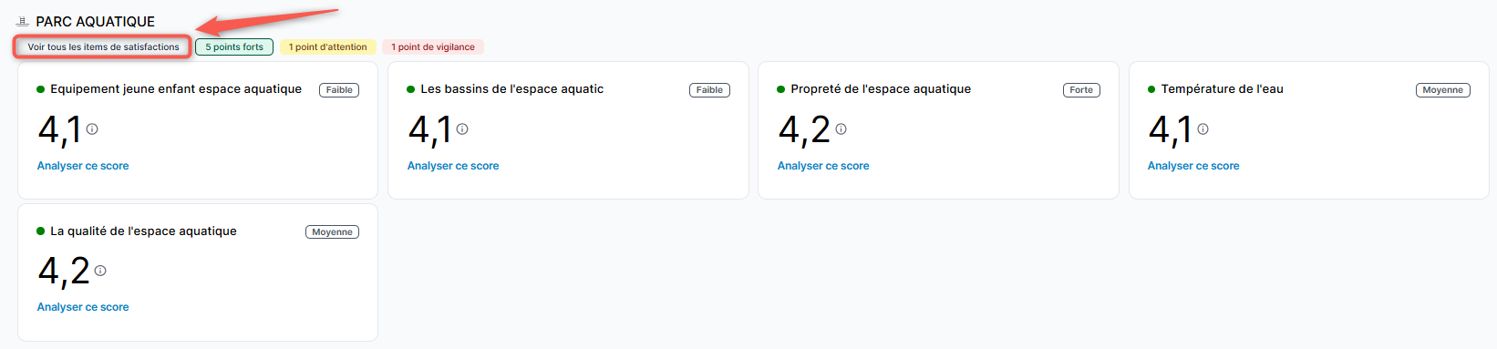 Pour consulter tous les items d'un moment-clé spécifique, cliquez sur le bouton "Voir tous les items de satisfaction". La liste s'adapte automatiquement aux filtres définis sur la page.
