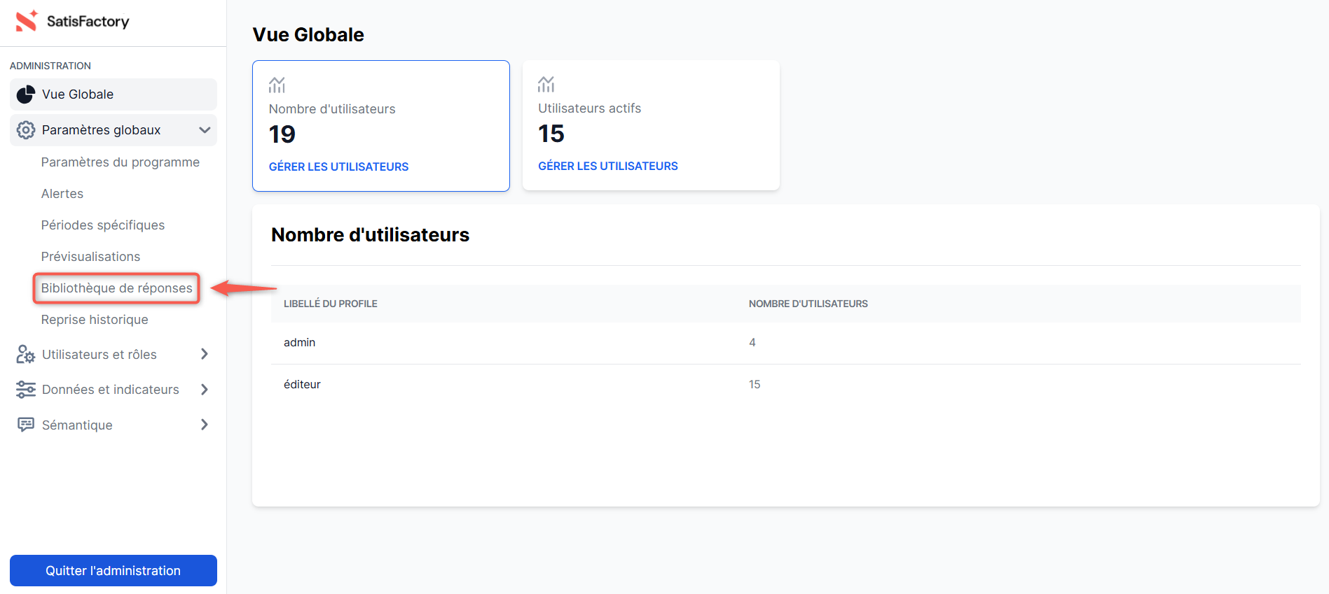 Ensuite, dans le menu latéral gauche du centre d'administration, déroulez la rubrique "Paramètres globaux", puis cliquez sur la section "Bibliothèque de réponses".