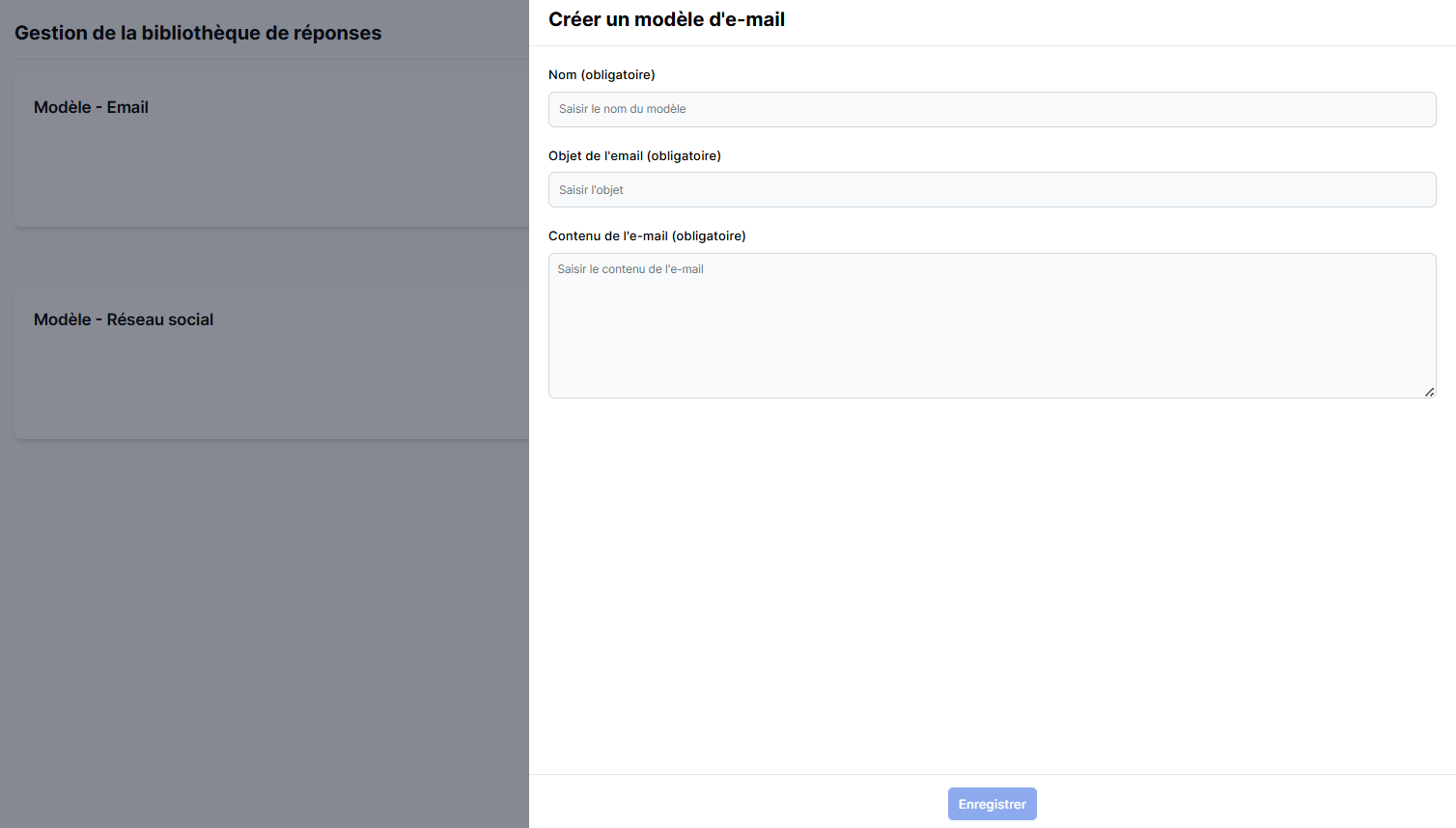 Un nouveau volet s’ouvre sur la droite, vous permettant de renseigner les informations nécessaires à la création de votre modèle de réponse. Les champs à compléter peuvent varier selon le type de modèle sélectionné.