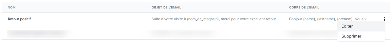 Pour modifier un modèle de réponse déjà existant, il vous suffit de vous positionner sur le modèle dans votre bibliothèque de réponses, de cliquer sur l'icône représentant une ellipse verticale (⋮) puis de cliquer sur "Éditer".