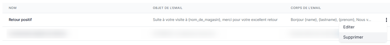 Pour supprimer un modèle de réponse déjà existant, il vous suffit de vous positionner sur le modèle dans votre bibliothèque de réponses, de cliquer sur l'icône représentant une ellipse verticale (⋮) puis de cliquer sur "Supprimer".