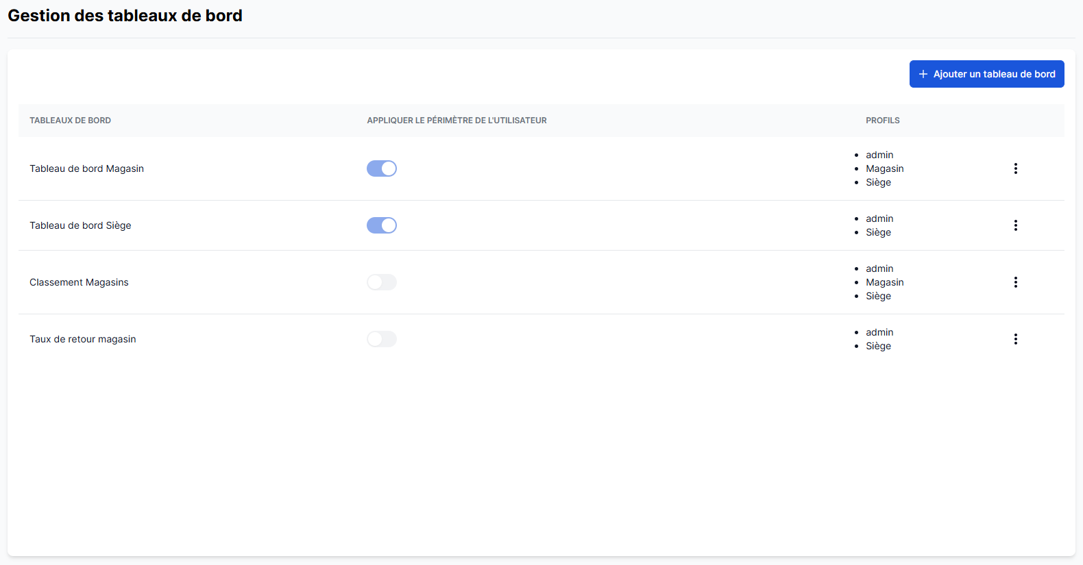 Pour garantir une interface épurée et efficace, ne donnez l'accès à un tableau de bord qu'aux profils pour qui ces analyses sont réellement pertinentes. Rien ne sert de surcharger l'espace de travail des utilisateurs avec des tableaux de bord qu'ils ne consulteront pas.