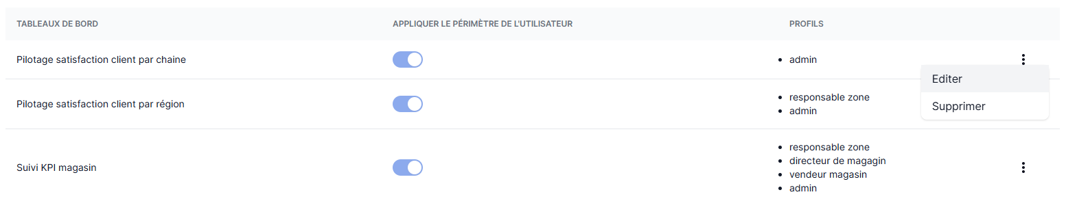 💭 Il est possible d'éditer librement le libellé, les libellés traduits, l'ordre d'affichage, l'application du périmètre d'utilisateur mais également les profils d'utilisateur agréés pour chaque tableau de bord.