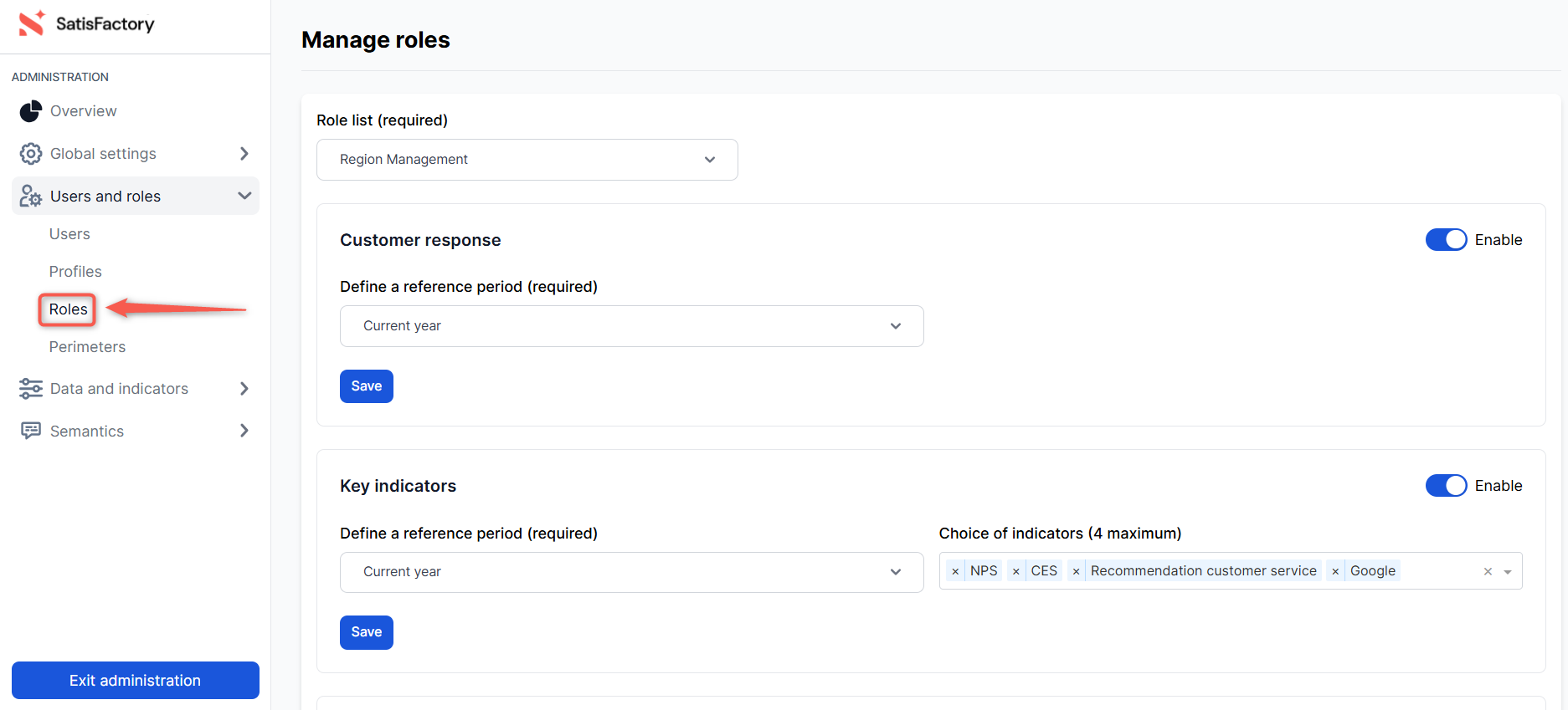 Then, in the administration center's left sidebar, expand the "Users and roles" section, then click on the "Roles" sub-section.