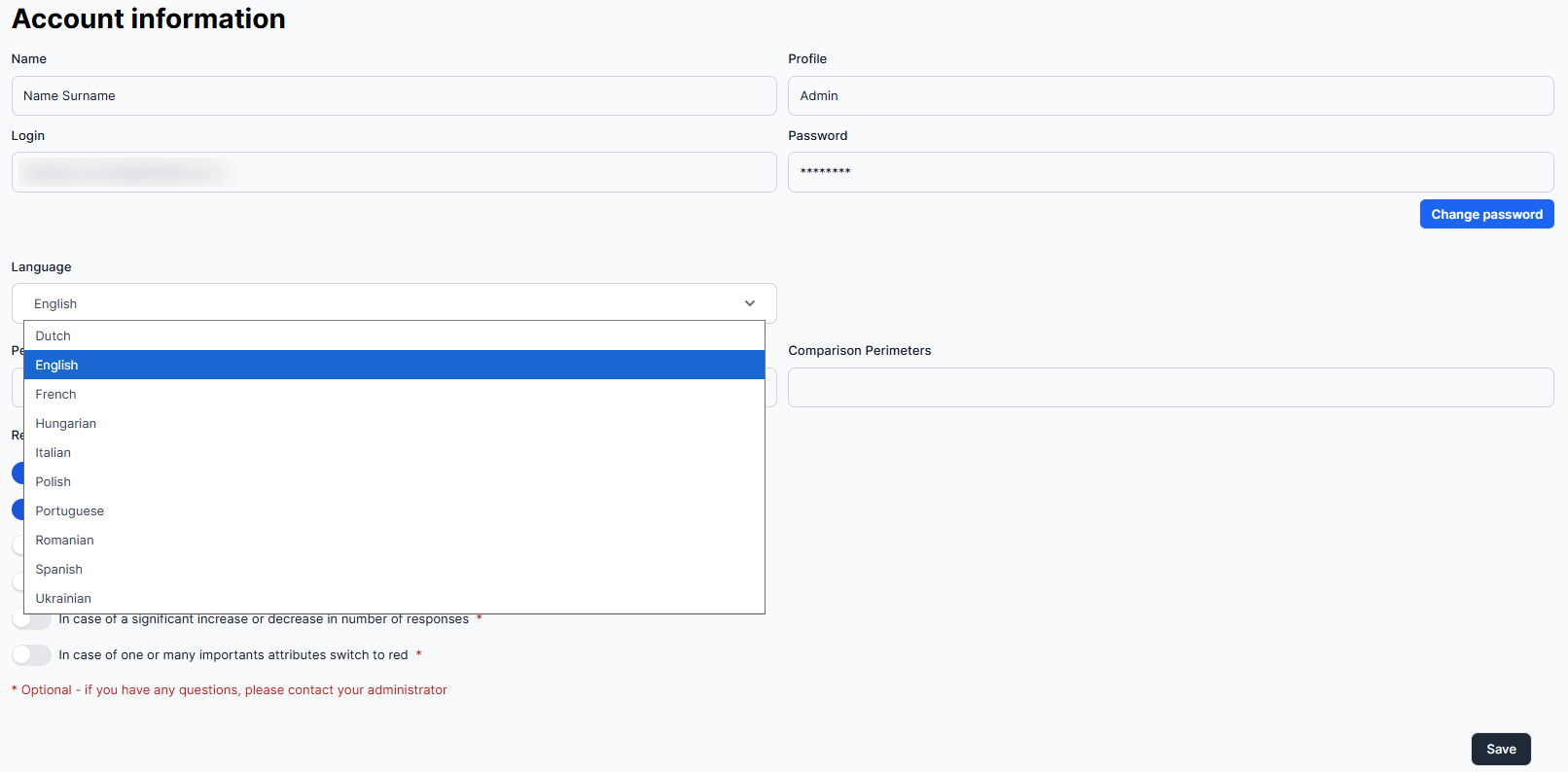 Once the new display language has been selected, press the "Save" button to apply the modification to the platform.