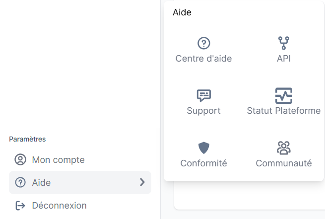 L'onglet "Aide" centralise tous les outils et ressources vous permettant d'approfondir votre connaissance des fonctionnalités de la plateforme ou d'obtenir du support.