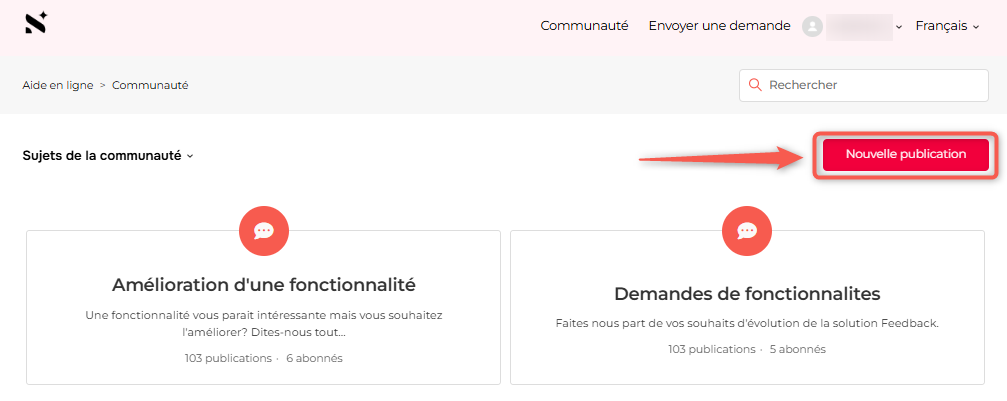 Au sein de la communauté, cliquez sur le bouton "Nouvelle publication" pour accéder au formulaire de demande d'évolution produit.