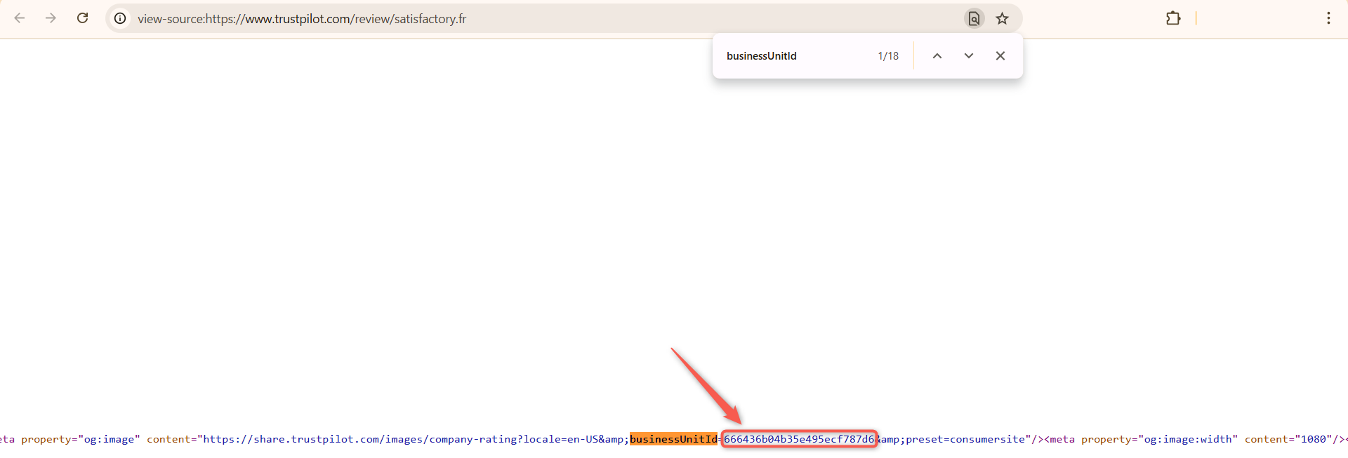 Une fois le code source ouvert dans un nouvel onglet, utilisez la fonction de recherche (Ctrl + F) et saisissez le terme "data-businessunit-id" ou "businessUnitId".