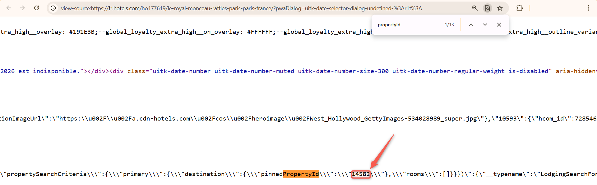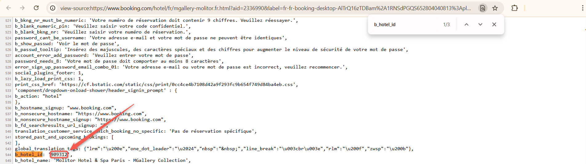 Une fois le code source ouvert dans un nouvel onglet, utilisez la fonction de recherche (Ctrl + F) et saisissez le terme "b_hotel_id".