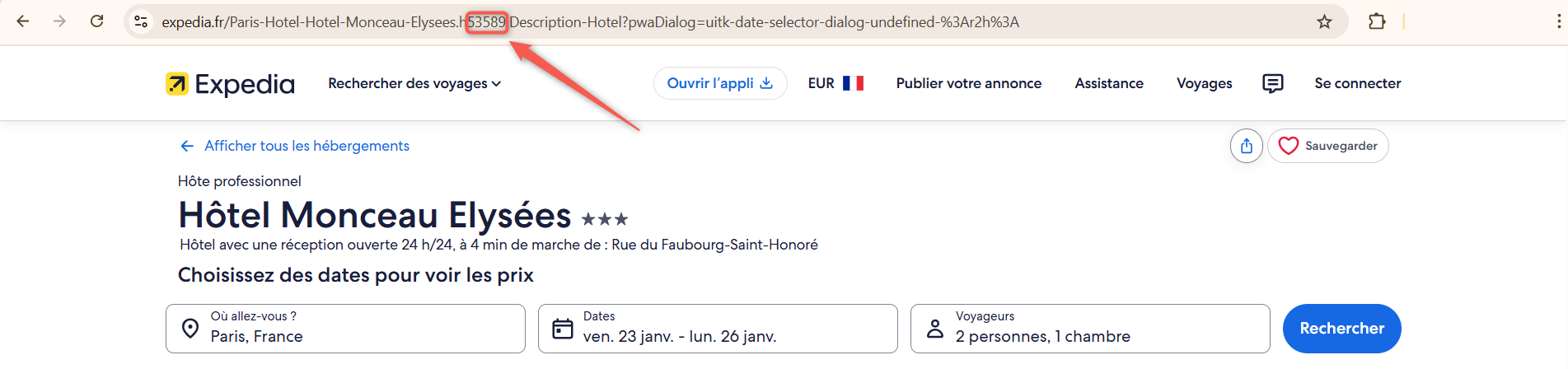 Récupérer le Property ID Expedia et l'URL d'un établissement