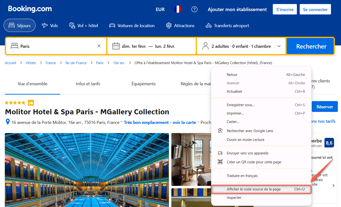 Commencez par accéder à la page publique de l'établissement concerné sur le site web Booking.com et affichez le code source de la page (via le clic droit ou le raccourci Ctrl + U).