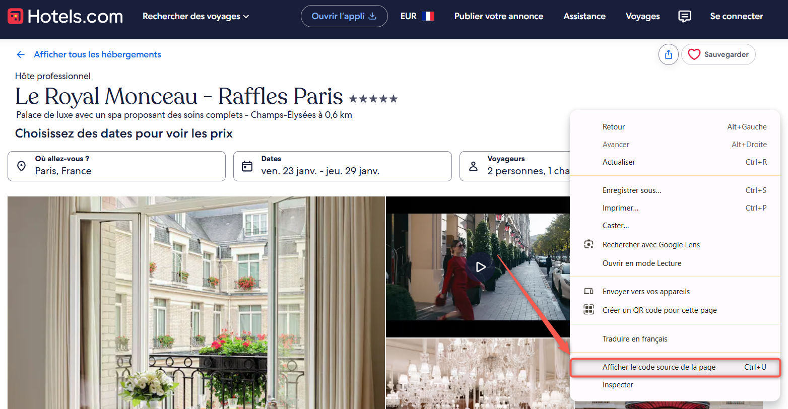 Commencez par accéder à la page publique de l'établissement concerné sur le site web d'Hotels.com et affichez le code source de la page (via le clic droit ou le raccourci Ctrl + U).