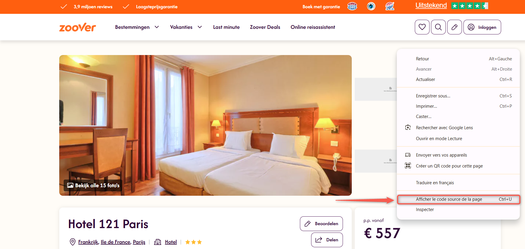Commencez par accéder à la page publique de l'établissement concerné sur le site web Zoover et affichez le code source de la page (via le clic droit ou le raccourci Ctrl + U).
