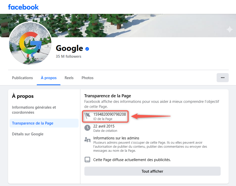 Copiez la suite de chiffres affichée à la ligne "ID de la Page", il s'agit de l'identifiant unique de la page Facebook.