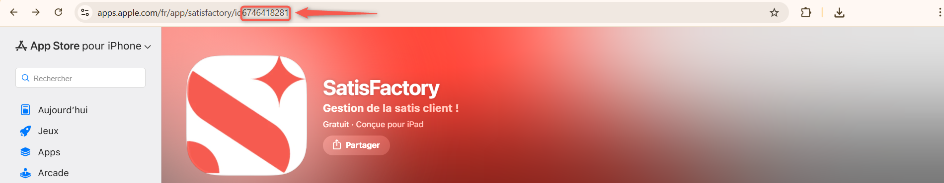 L'URL à préciser dans la plateforme SatisFactory est celle que vous pouvez trouver dans la barre d'adresse, sur la page de l'application App Store concernée.