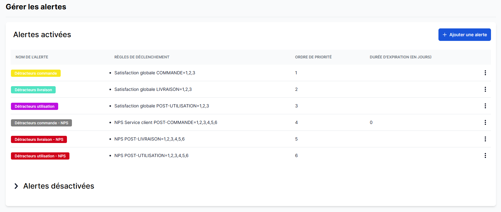 Définissez un délai d'expiration cohérent avec vos capacités opérationnelles de traitement (exemple : 7 jours). Un délai trop court génère de la frustration en multipliant les alertes avec un statut "expiré" avant même d'avoir pu agir, tandis qu'un délai trop long dilue le sentiment d'urgence nécessaire à une reconquête client efficace. Privilégiez toujours le traitement des alertes urgentes (qui expirent dans moins de 72 heures).