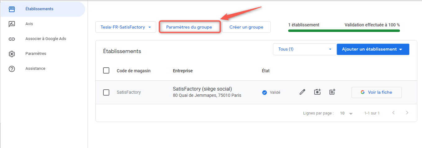 Depuis la page "Établissements", sélectionnez votre groupe nouvellement créé et accédez à l'onglet "Paramètres du groupe".