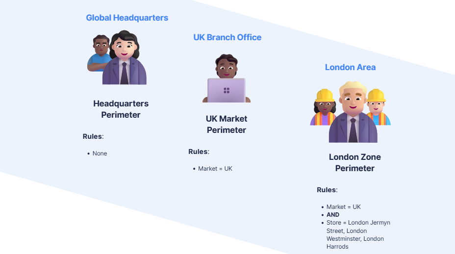 Adopt a clear and structured naming convention (examples: "Zone - North", "Store - Manager Barcelona Mall", "Store - Sales Associate Warsaw Stand 3"). Explicit naming enables administrators to instantly identify perimeter granularity and geographic coverage without needing to open it.