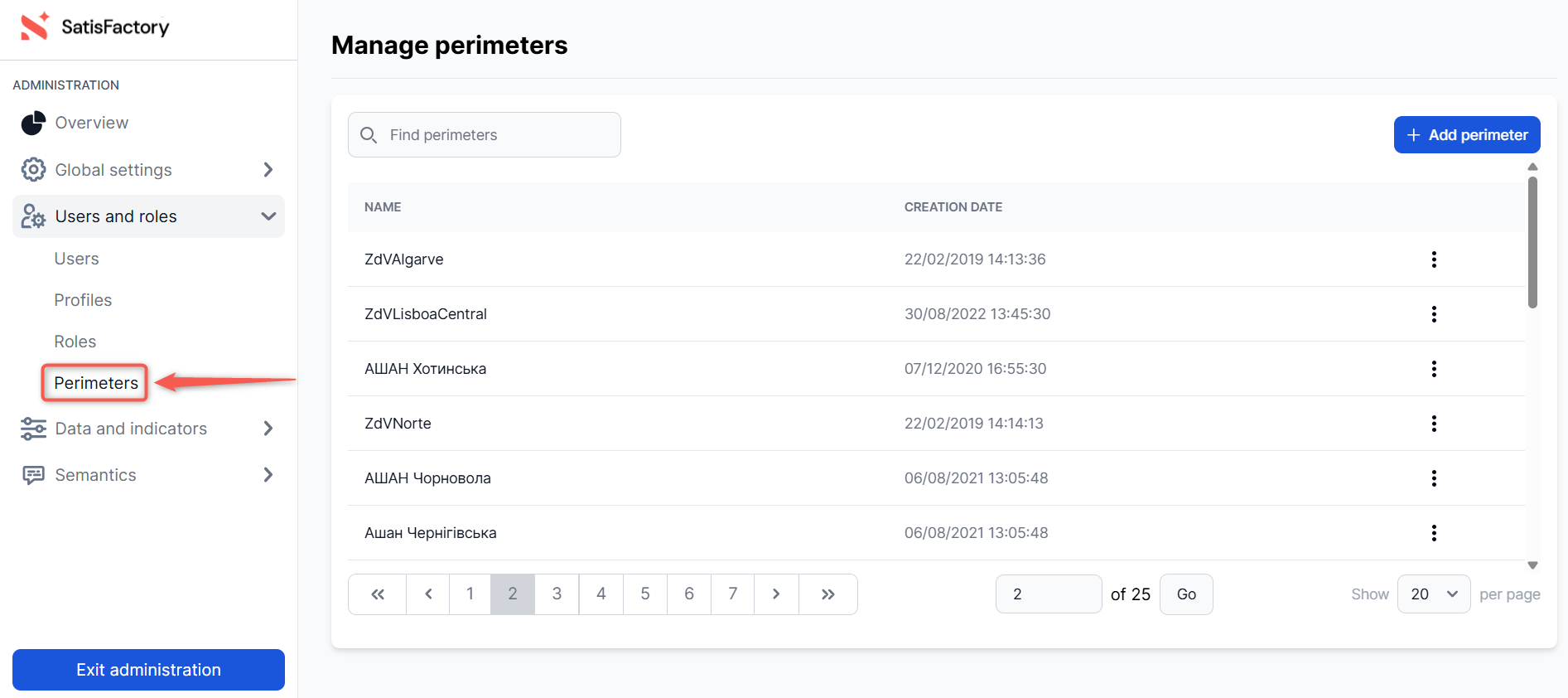 Then, in the administration center's left sidebar, expand the "Users and roles" section, then click on the "Perimeters" sub-section.