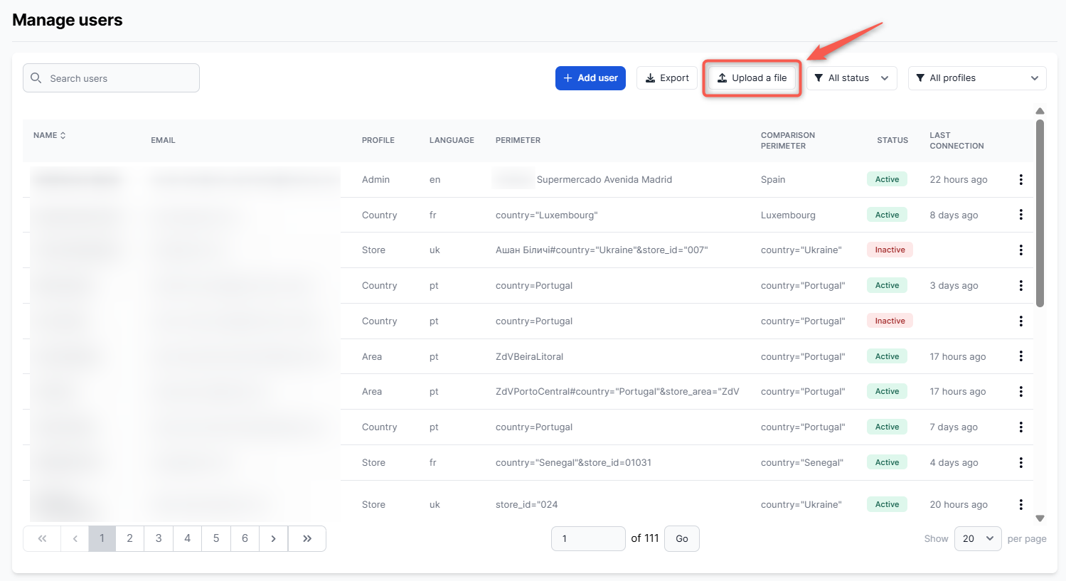 From the "Users" section of the administration center, click the "Upload a file" button located in the upper right part of the page.