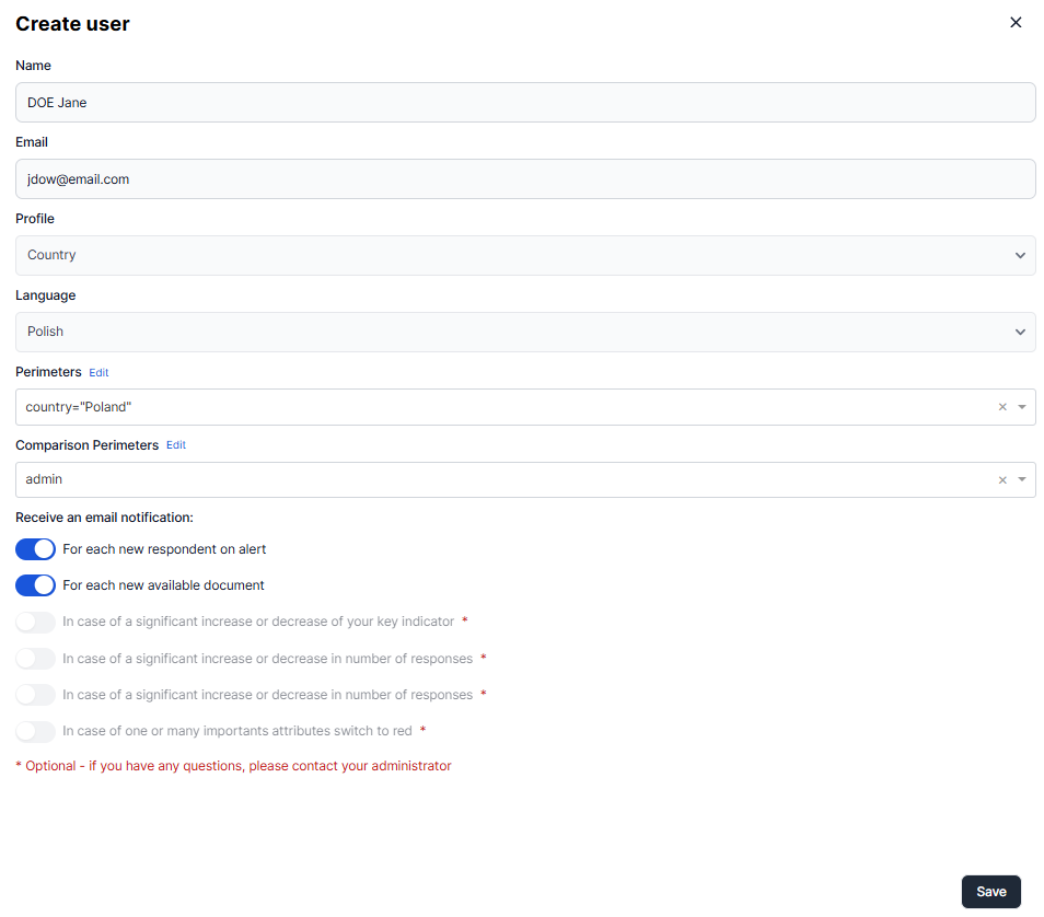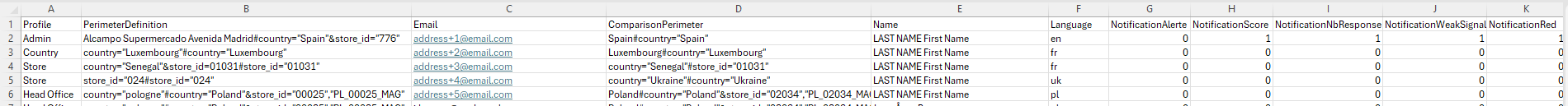 NotificationAlerte | Automatic notification in case of a response triggering an alert within the user's perimeter | "1" for the user to subscribe to this notification; "0" to opt out |