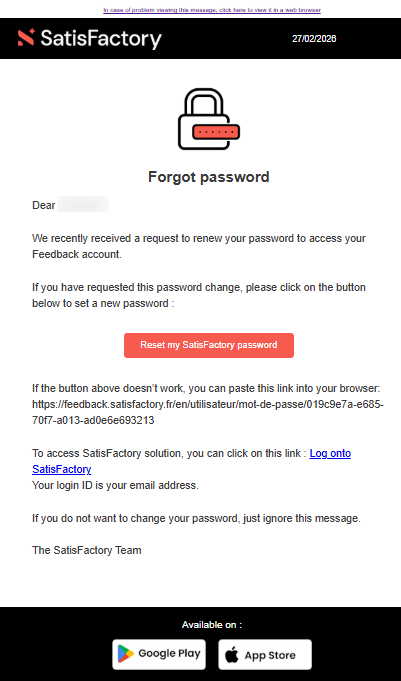 If the password reset email does not appear in your inbox, check your junk mail (spam) and search for the sender "satisfactory@email-booster.satisfactory.fr".