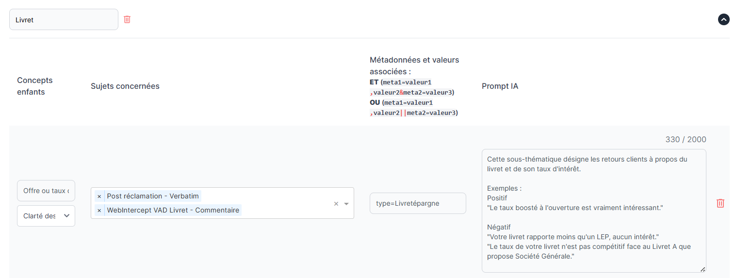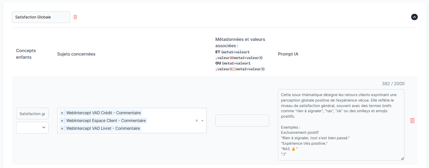 ⚠️ La suppression d'un concept n'impacte pas l'historique de classement des commentaires. Si vous souhaitez que ces changements s'appliquent sur l'ensemble des commentaires accessibles sur votre compte, il est nécessaire d'effectuer une reprise d'historique. Nous vous invitons donc à solliciter votre Customer Success Manager pour procéder à cette prestation spécifique.