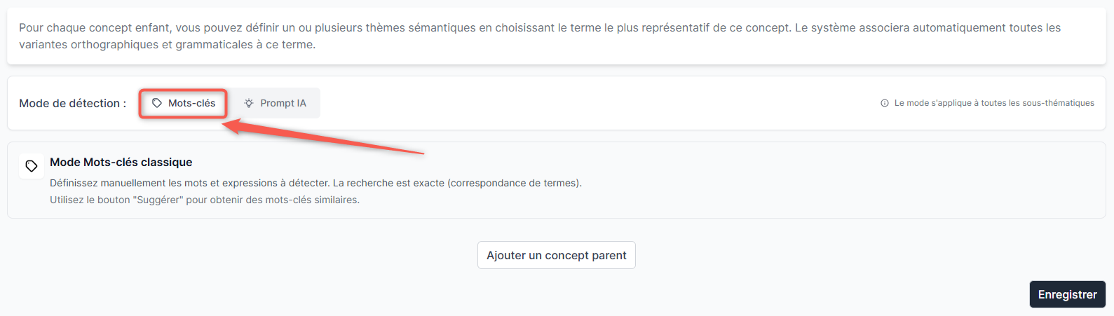 Pour modifier ou faire évoluer un concept issu du plan de classement sémantique, il vous suffit tout d'abord de cliquer sur l'onglet approprié "Mots-clés" ou "Prompt IA" dans la page "Analyse sémantique".