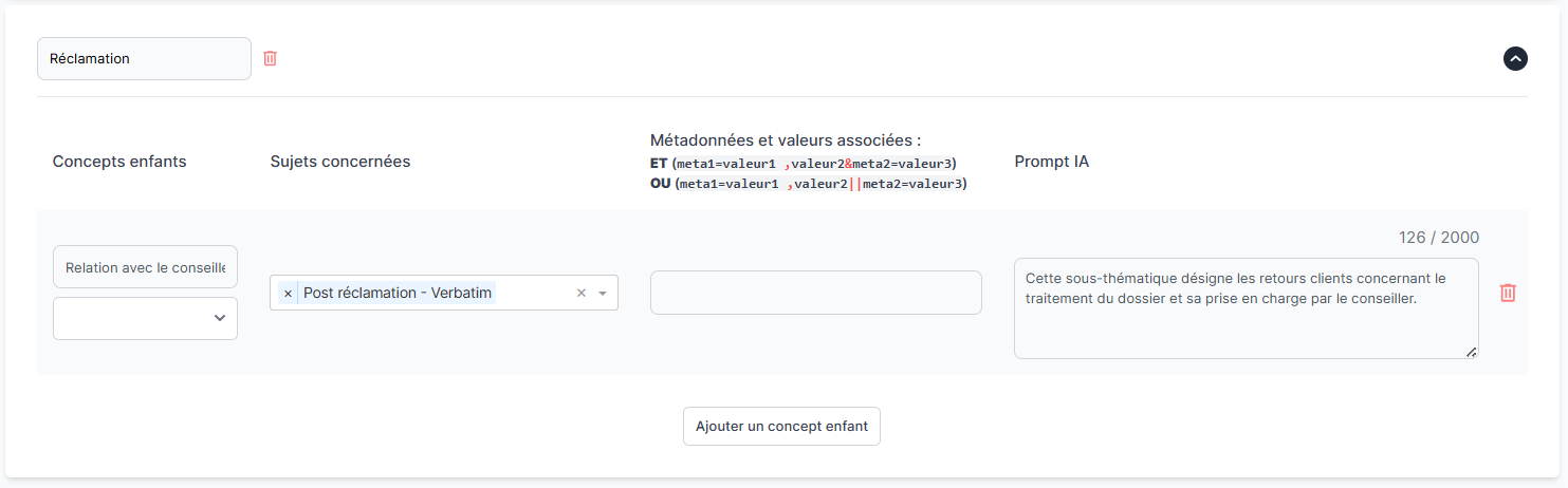 | Concept enfant 2 | Ce concept enfant désigne les retours clients concernant ... | |