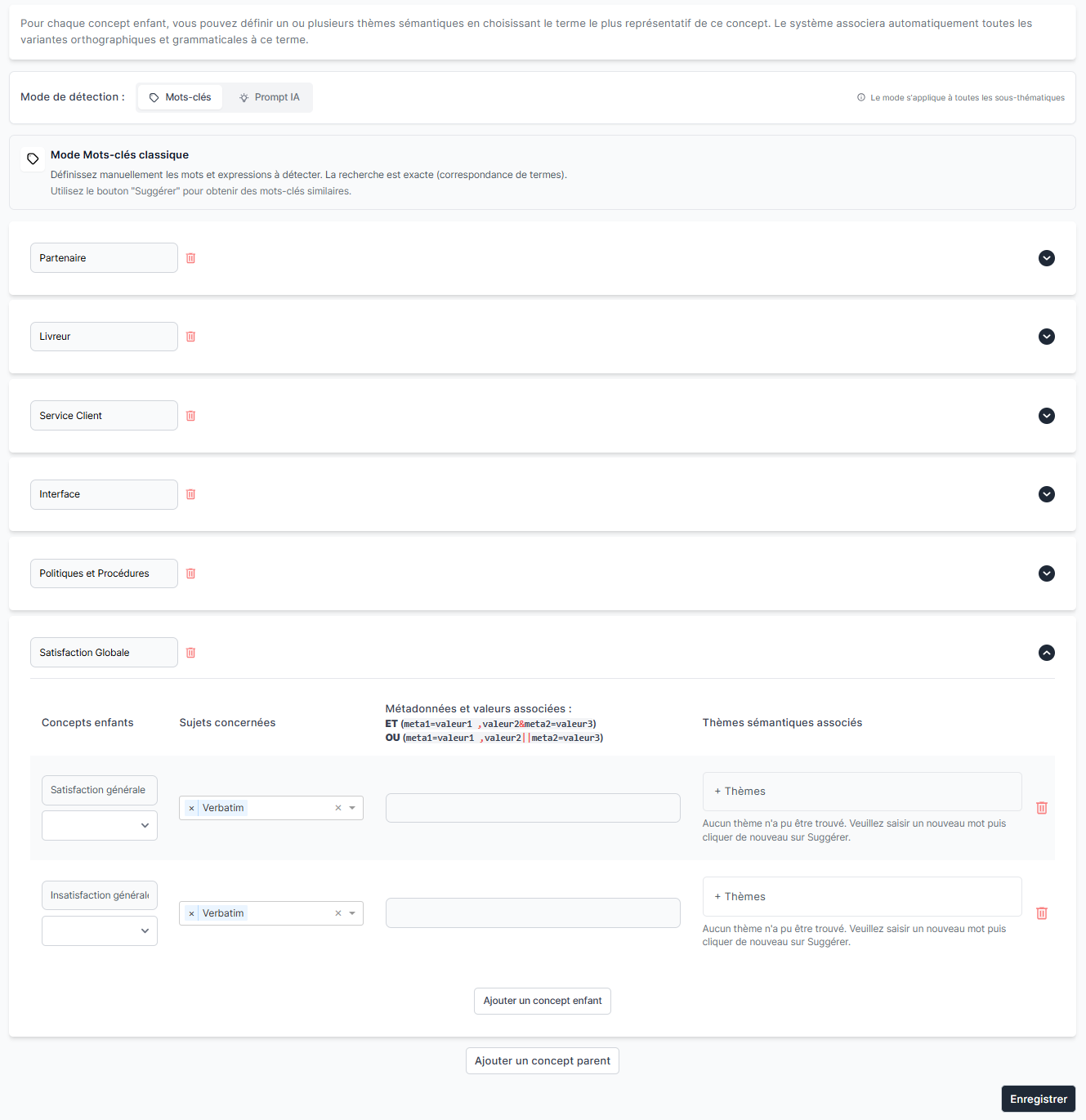 Saisissez les thèmes qui permettent de classer les commentaires dans ce concept enfant. Il est nécessaire de définir les thèmes pour chaque langue.