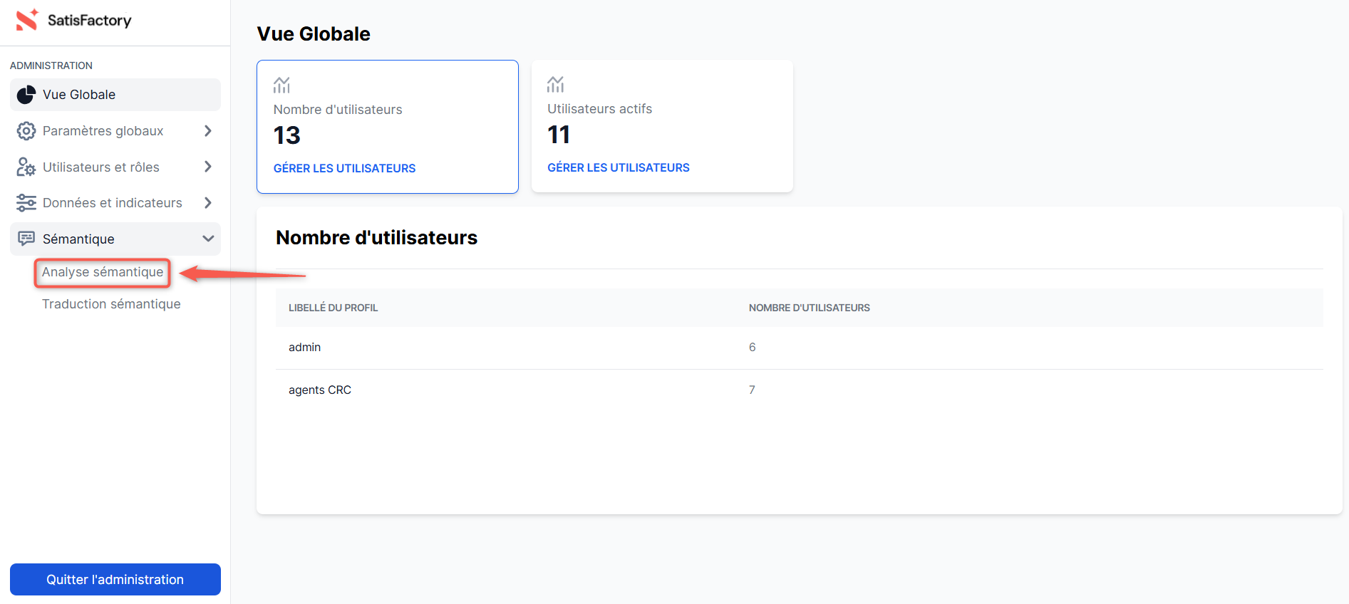Ensuite, dans le menu latéral gauche du centre d'administration, déroulez la rubrique "Sémantique", puis cliquez sur la section "Analyse sémantique".