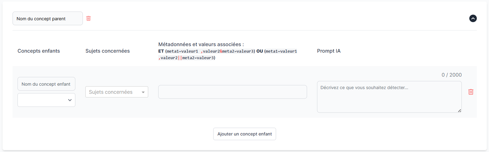Pour créer un sous-niveau au sein d'un concept parent, cliquez sur le bouton "Ajouter un concept enfant" et paramétrez ce nouveau concept.