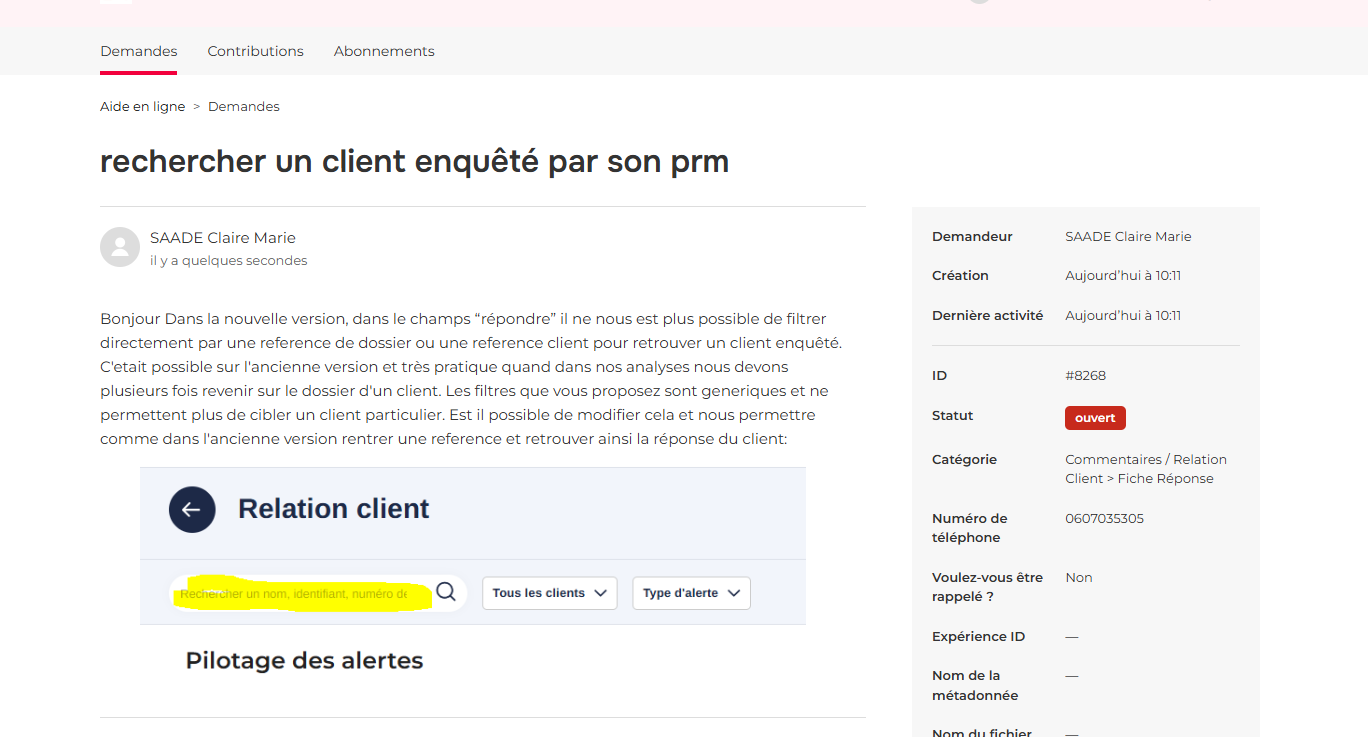pouvez vous rajouter une fonctionnalité dans la nouvelle version de feedback nous permettant de rechercher le dossier d'un client par sa reference comme c'était le cas dans l'ancienne version: Ceci nous permettrait de rapidement retrouver le dossier d'un client car aujourd'hui avec les filtres trop de manipulations sont à faire pour retrouver un dossier. Merci