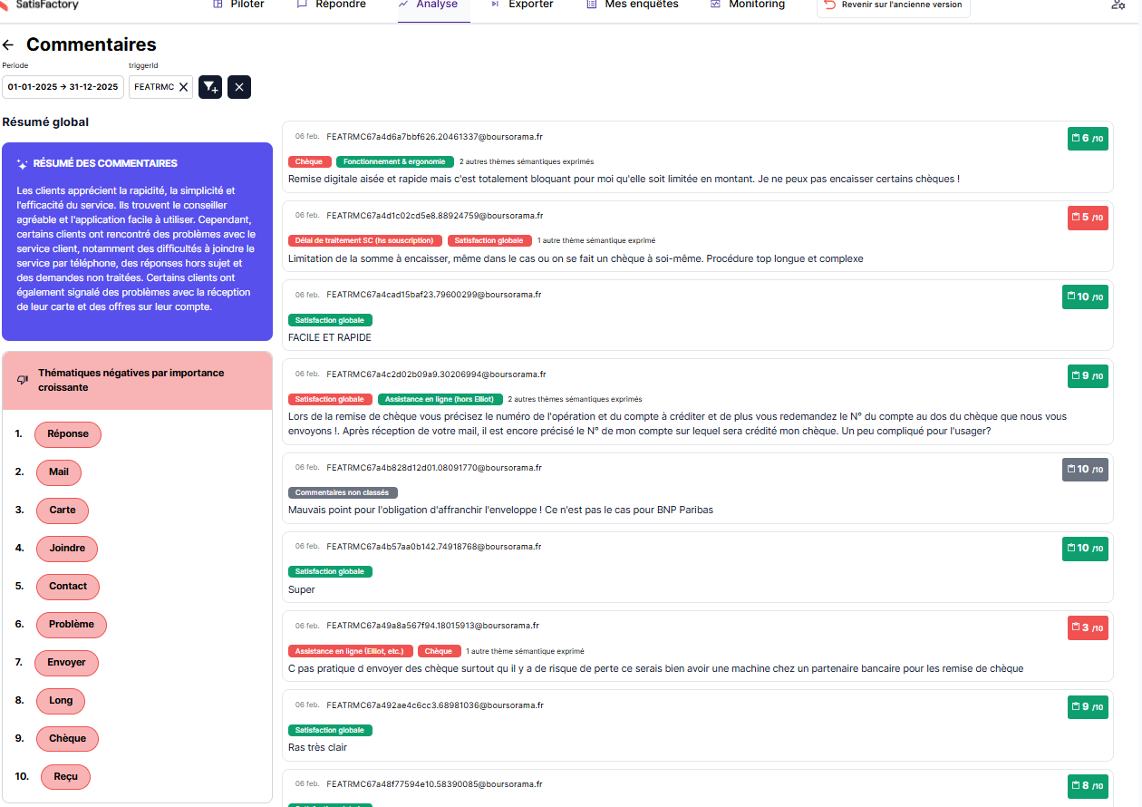 Je constate qu'il est impossible d'exporter via fichier excel / csv les verbatims dans l'onglet “analyse”, “commentaires clients”. Pouvez-vous me confirmer que cette fonctionnalité sera bien embarquée dans la version finale de la plateforme ?