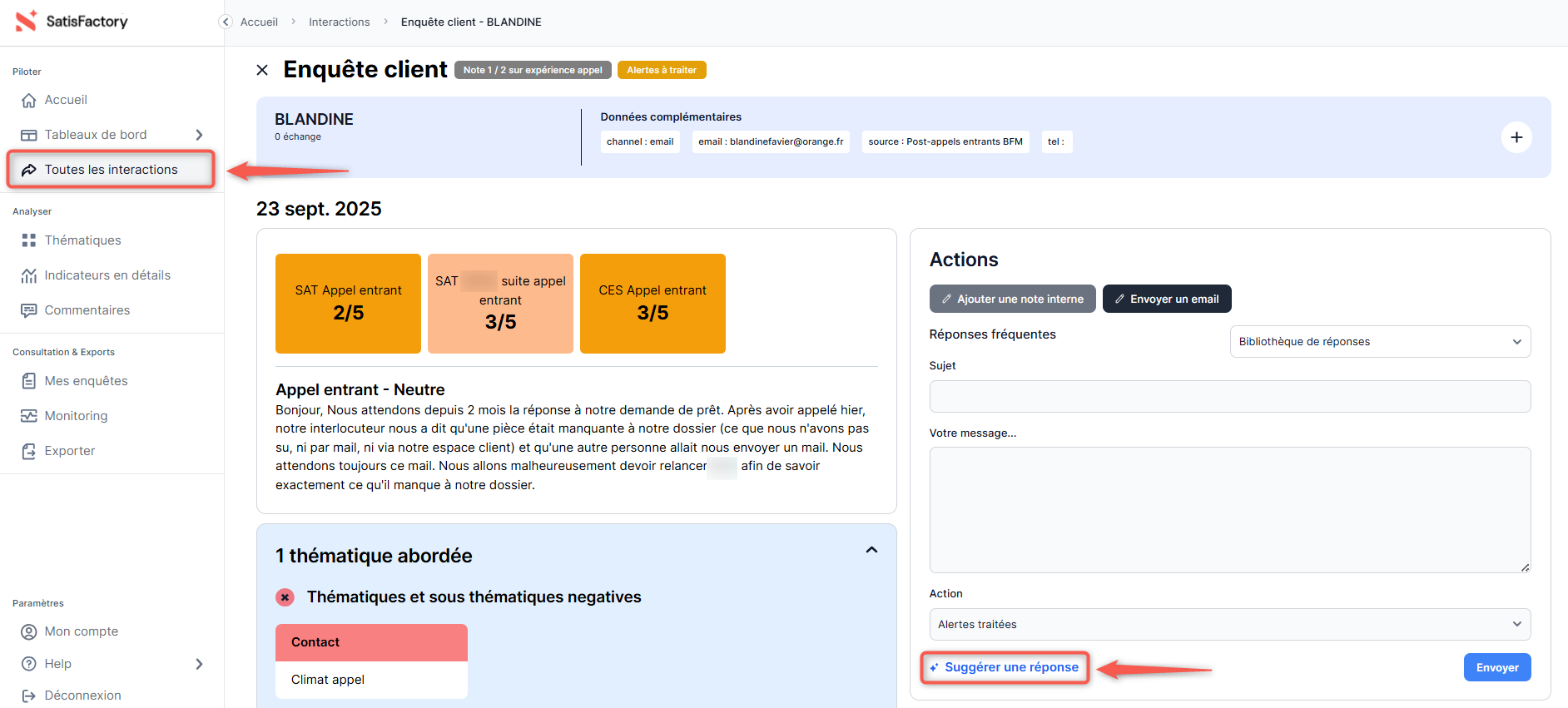 Depuis la fiche du répondant, après avoir cliqué sur les boutons "Envoyer un email" ou "Répondre à un avis" (disponibles selon le paramétrage de votre compte et la source du feedback), le bouton "Suggérer une réponse" devient disponible.