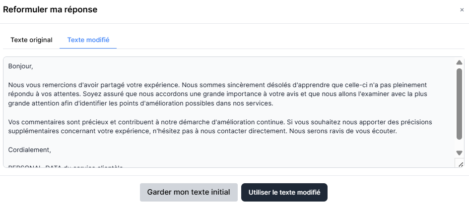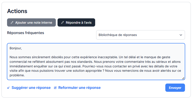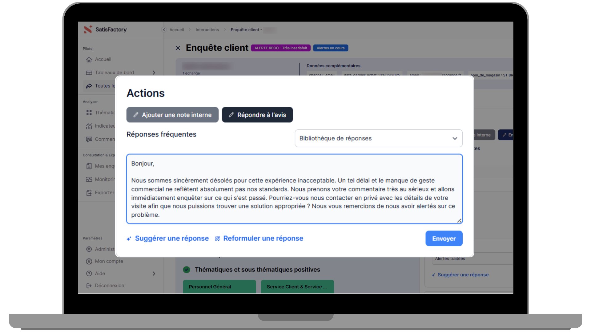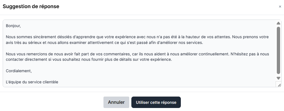 Répondez plus rapidement et plus efficacement aux retours de vos clients grâce à la fonctionnalité d’intelligence artificielle de SatisFactory. Cette technologie avancée génère en quelques secondes des réponses personnalisées, pertinentes et professionnelles, que vous pouvez facilement ajuster avant l'envoi pour refléter votre ton et renforcer la qualité de votre relation client.