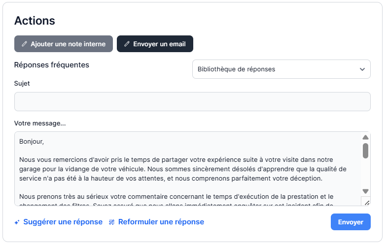 ⚠️ Les fonctionnalités de suggestion et de reformulation de réponse par intelligence artificielle ont pour vocation d’accompagner la rédaction de vos messages. L'outil s'utilise conjointement avec votre bibliothèque de réponses (en savoir plus). En revanche, ces fonctionnalités ne réalisent en aucun cas l’envoi automatique de réponses aux clients.
